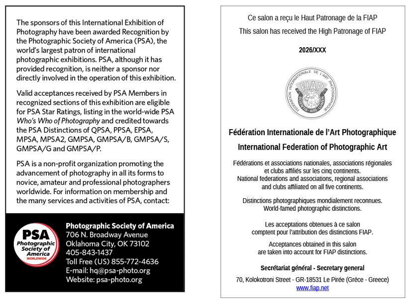 The salon will be conducted in accordance with the rules of the PSA, FIAP & ISFA. Acceptances obtained in this salon will be taken into account for ISFA, FIAP Distinctions and PSA Star Rating listings in the worldwide PSA Who’s Who of Photography.